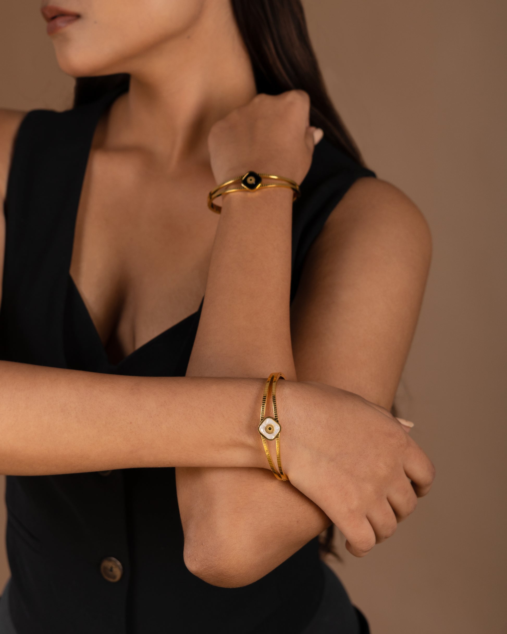 Featuring a contemporary twist on the traditional evil eye, this minimal arm accessory adds a touch of protection and trendiness to any outfit. Keep the bad vibes away with a quirky and stylish touch. (No need for superstitions, just good fashion!)